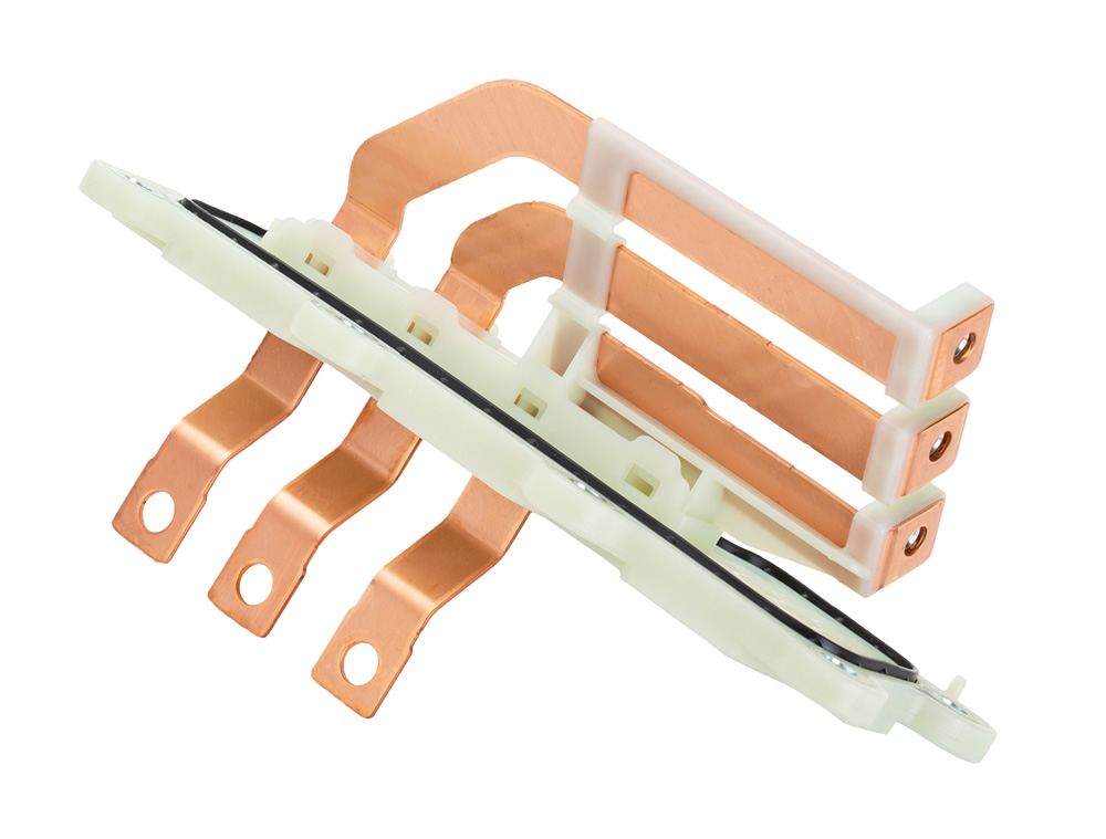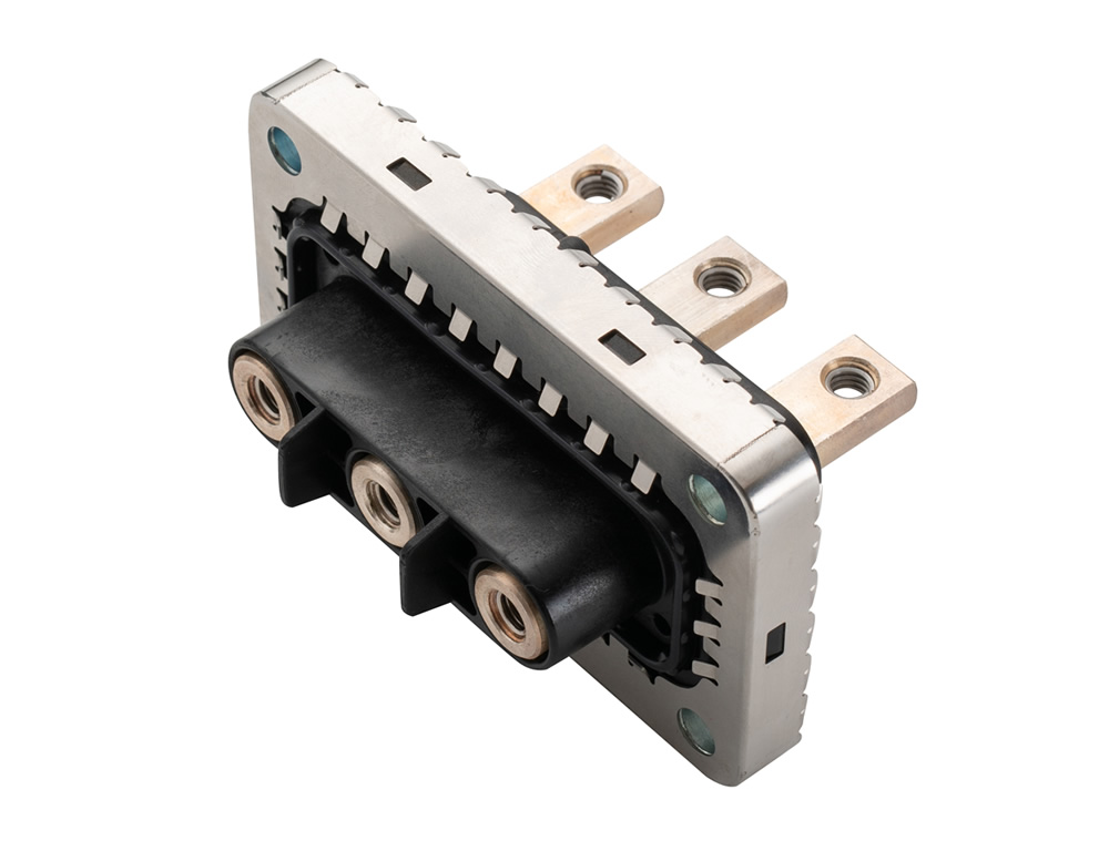 应用于电机与电控之间的连接,主要为电机与电控的二合一集成式开发,替代了传统的三相线束连接